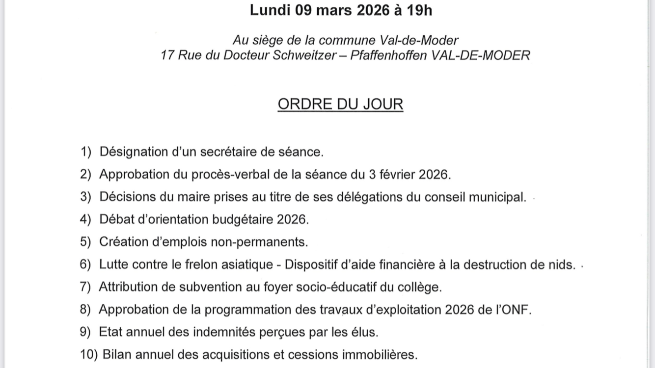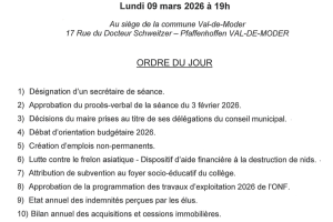 Le prochain Conseil Municipal aura lieu le lundi 9 mars 2026 à 19h00 au siège de la commune Val-de-Moder :