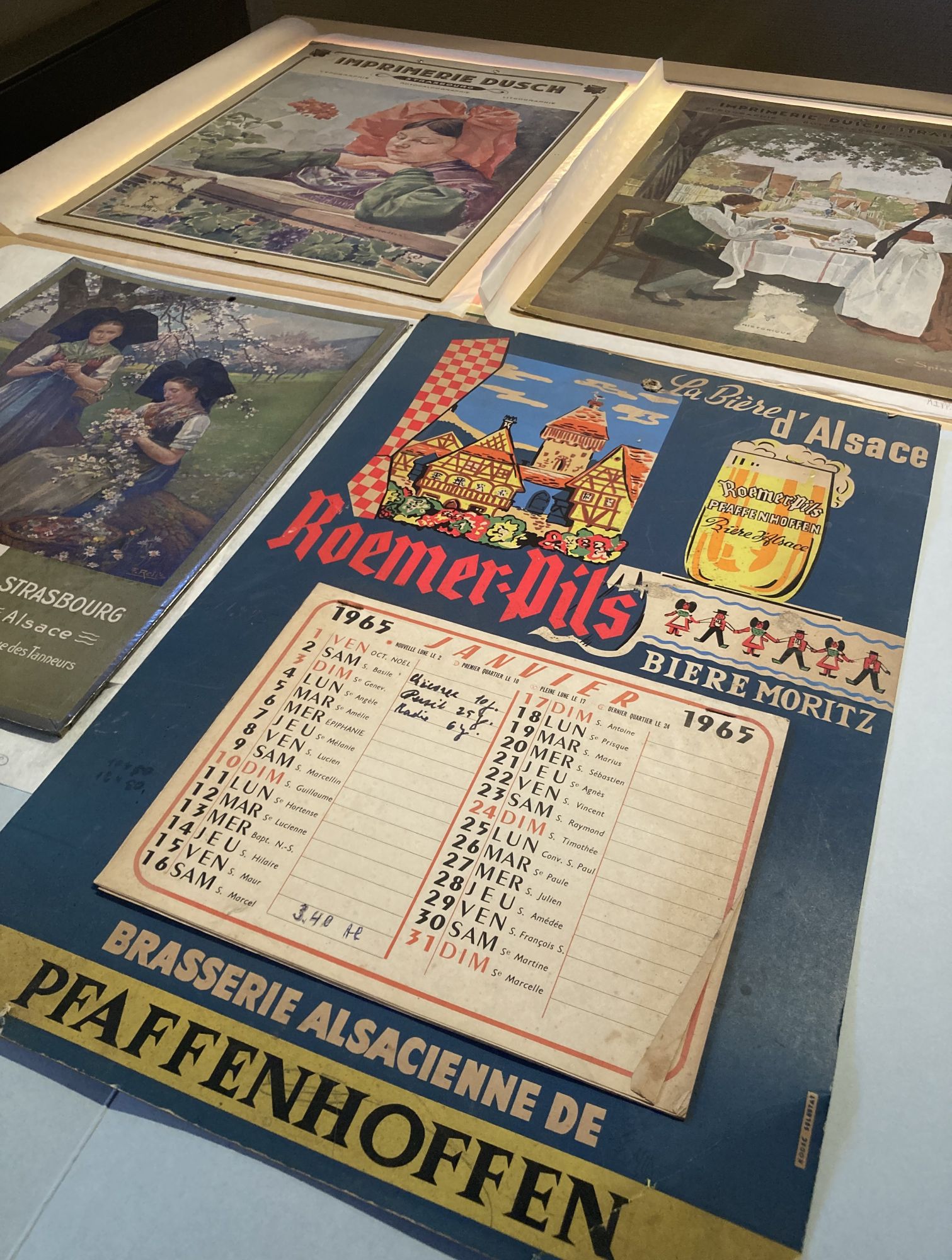 > de magnifiques calendriers illustrés, dont certains sont signés Spindler ou issus de brasseries locales.