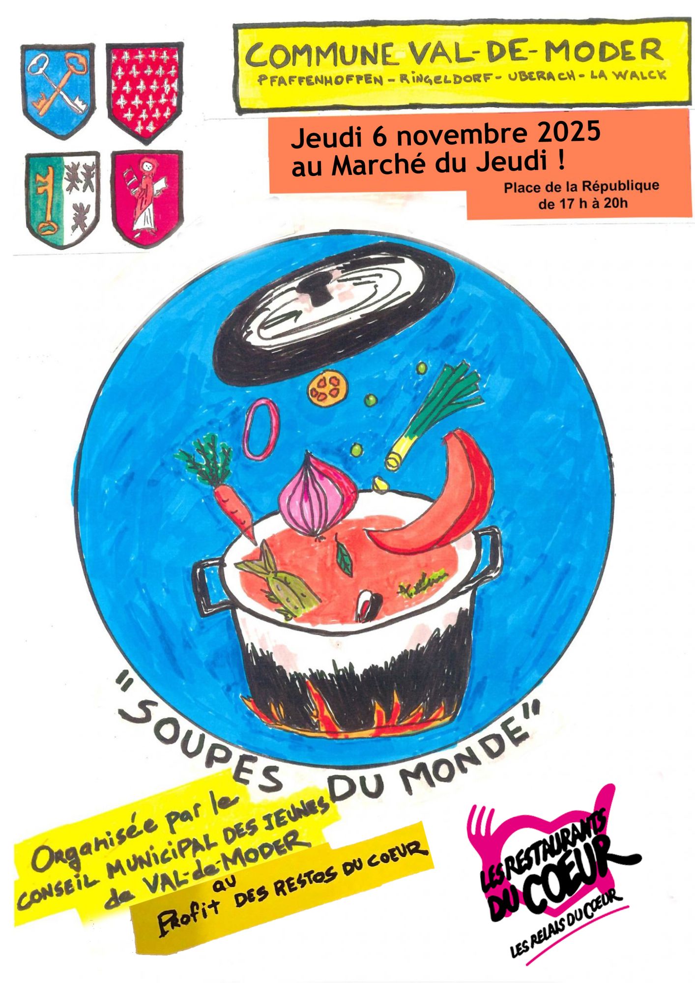 Dans le cadre des "Animations du marché du jeudi", le Conseil Municipal des Jeunes vous invite à découvrir un événement chaleureux et convivial : "Soupes du Monde", qui aura lieu le jeudi 6 novembre 2025 sur la Place de la République.